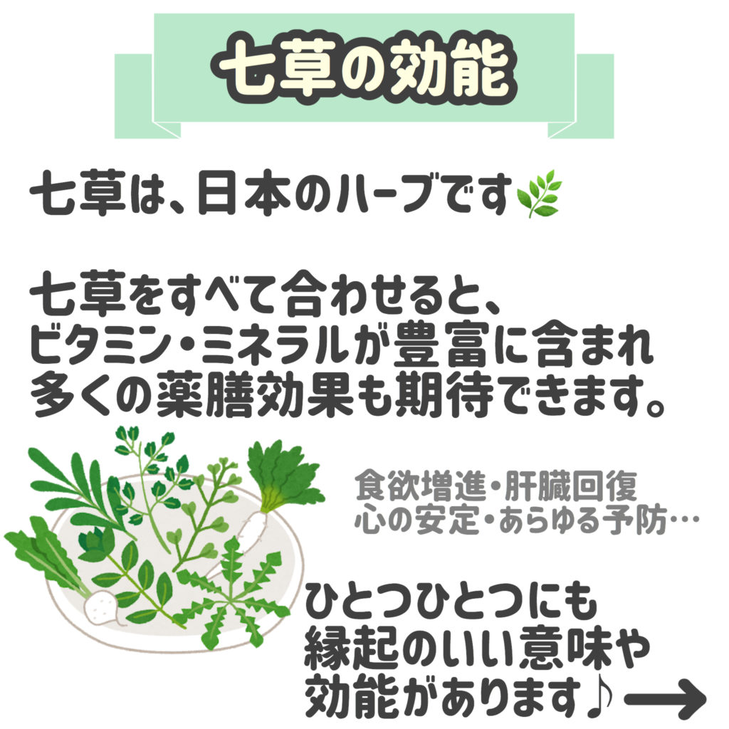この七草、ひとつひとつには縁起のいい意味が込められ、それぞれの効能があるのでご紹介します。
